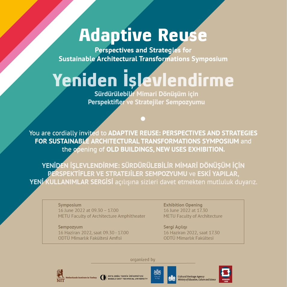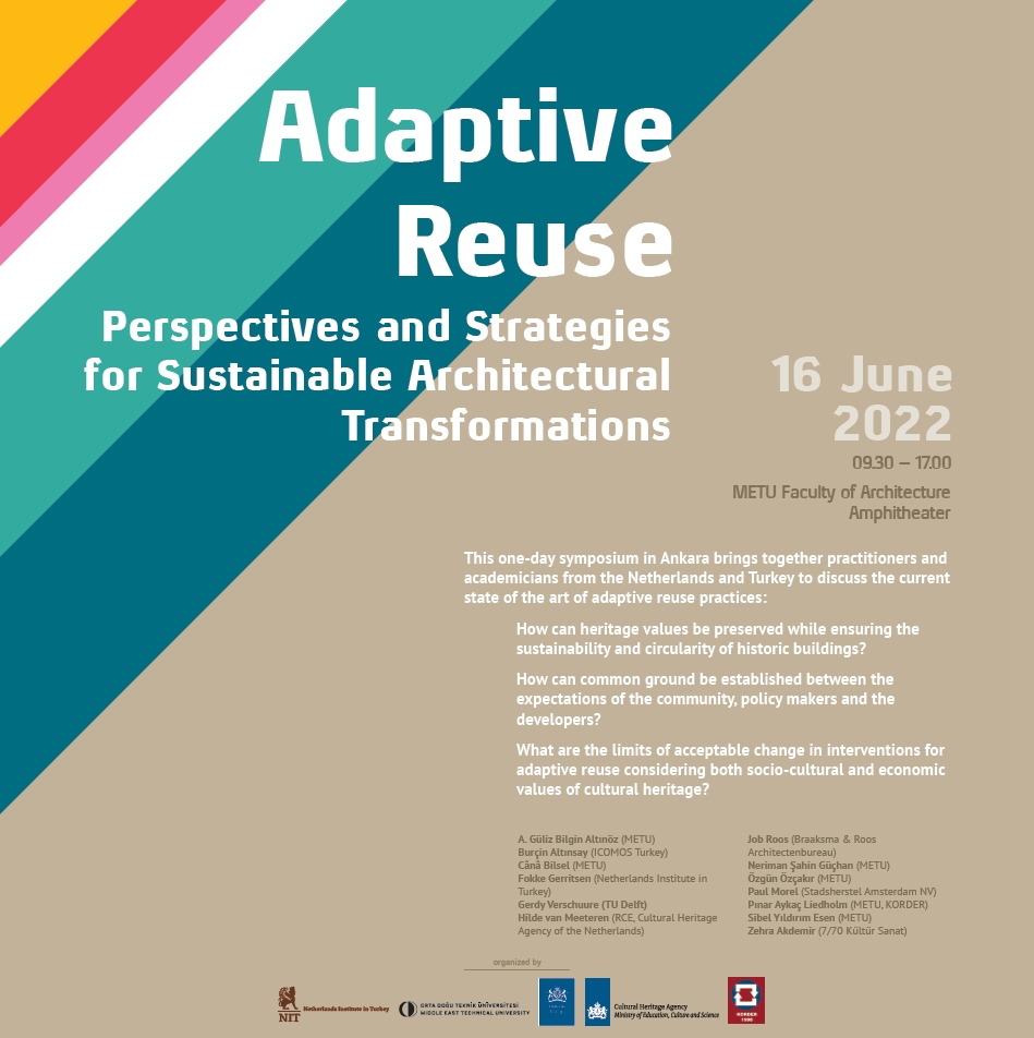 This one-day symposium in Ankara brings together practitioners and academicians from the Netherlands and Turkey to discuss the current state of the art of adaptive reuse practices: How can heritage values be preserved while ensuring the sustainability and circularity of historic buildings? How can common ground be established between the expectations of the community, policy makers and the developers? What are the limits of acceptable change in interventions for adaptive reuse considering both socio-cultural and economic values of cultural heritage?